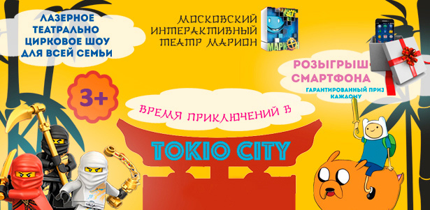 Отдых с детьмиДевчонки! В день защиты детей 1.06 приходите с детьми на цирковое представление! «Время приключений в Токио Сити» от Московского интерактивного театра Марион в ДК МАИ. Специальная для вас скидка 50%. Чтобы воспользоваться скидкой нужно зайти на сайт Teatr-marion.ru, открыть афишу и выбрать нужные места, и при оплате ввести промо код TOKIOCITY0106.