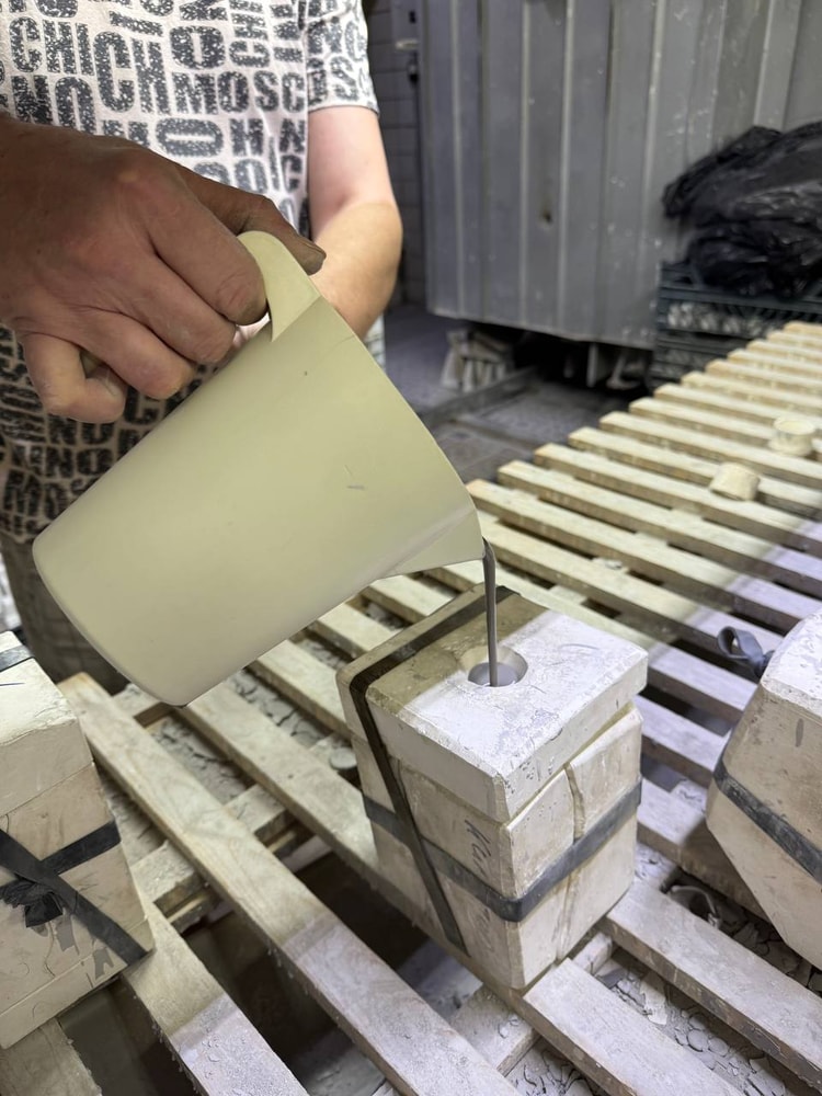 Следующим этапом мастер заливает в каждую форму жидкий фарфор (шликер), похожий на молочную смесь. Порошок для изготовления шликера закупается у российских и китайских производителей.