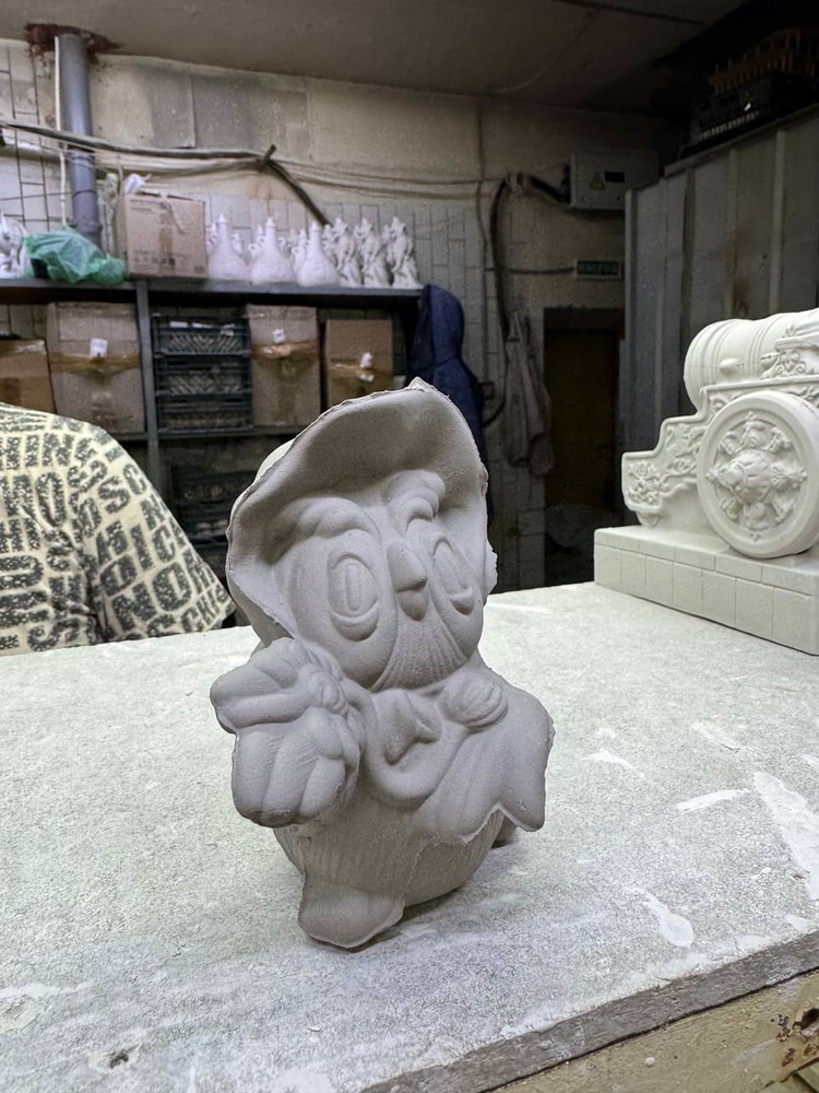 У изделия вдоль корпуса проходит шов, образовавшийся от половинок коробка. Его счищают ножиком и промокают фигурки губкой, чтобы убрать возможные крошки. Этот процесс называется обмывкой. Теперь они должны сутки подсохнуть, после чего будут готовы к первому обжигу.
