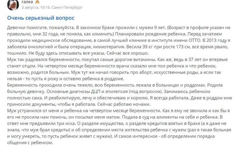 Вопрос - ответЕсть здесь одна девушка Галина, с очень больной дочерью, которая сама перенесла рак. Сразу когда начала её читать- первая мысль -врет. Ну которую отчим избивает. И судится она с мужем и свекровь там на неё кидается. Она ничего не просит здесь, просто пишет-дорогие лекарства, одежда верхняя -слезы, в магазин даже не пустили их. И на этом фоне у неё такой стресс что она прям пришла и пишет пишет пишет во все сообщества. И все комментарии с предложением помочь - скажите ваш размер, куда вам выслать вещи и прочее в этом духе.