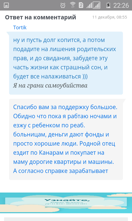 Автор пишет пост "Я на грани самоубийства" и в комментариях, выложенных выше Гульджан, читатели это триллера понимают, что у папы ребенка уже не кредиты в банках и домик в сельской местности на двоих с мамой, а квартиры и отдых на Канарах. Ребенок уже с инвалидностью, а мама опять таки замучалась ездить по реабилитациям и больницам.