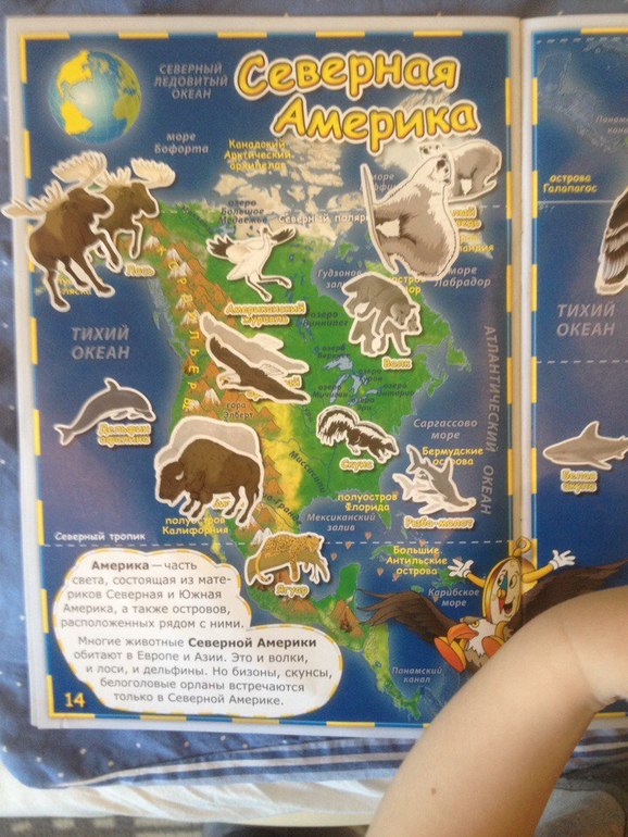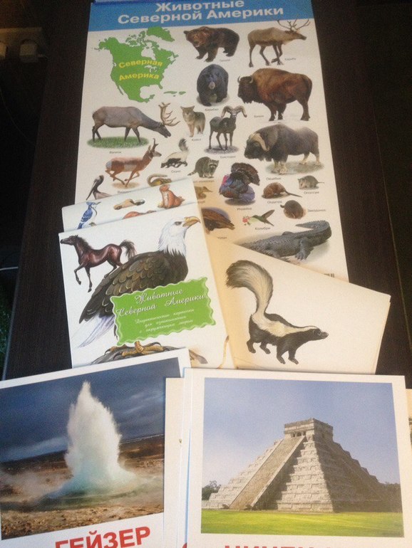 Посмотрели плакат, карточки, нашли какие фигурки этих животных у нас есть. Нашли на карте мира Северную Америку. Я называла животное, а Яр искал его на карте. Также рассмотрели там Большой каньон, Ниагарский водопад и гейзеры. Что такое водопад мы уже проходили, попробовала объснить, что такое гейзеры.