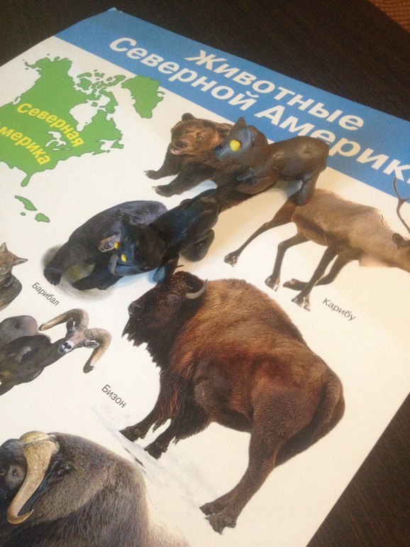 Когда эмоции по поводу новой игрушки немного поутихли, предложила посмотреть новый плакат с животными и карточки. Сегодня будем изучать животных Северной Америки.