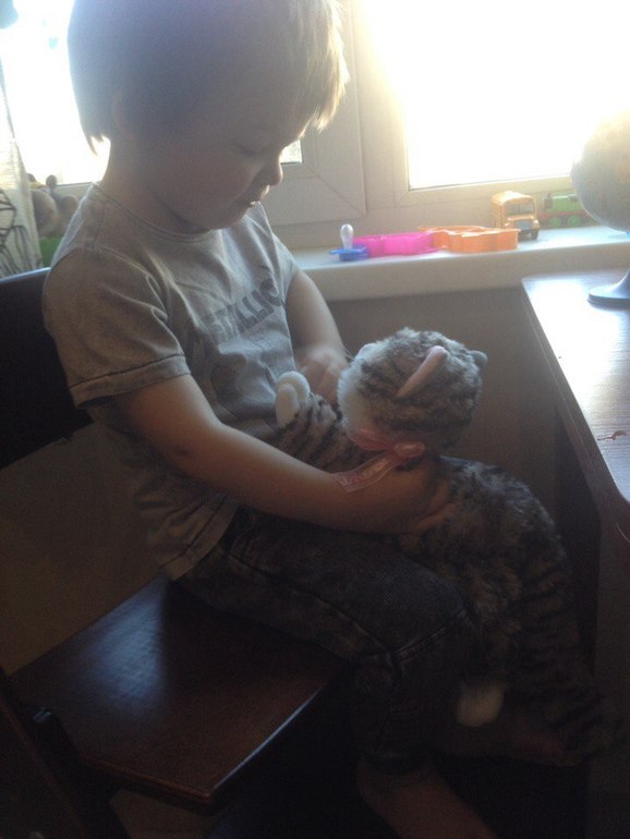 Как досмотрел мульт, пришел ко мне на кухню. Пока готовила и посуду мыла, сделали артикуляционную гимнастику, поповторяли потешки про котиков, потом стихотворения (Кискино горе; Котенок Барто; Котенок Берестов). А потом я сказала, что к Ярику кто-то пришел и достала мягкую игрушку котёнка. Восторгу то было! (полвечера вчера носилась по всем магазинам, еле нашла). Мы опять ему все потешки и стишки рассказали. Добавили еще стихотворение Маршака "Усатый-полосатый". Обыграли все действия. Покормили мясом, рыбкой и молочком, спать уложили, умыли, поиграл котенок с карандашами, завернули его в платок и тд.