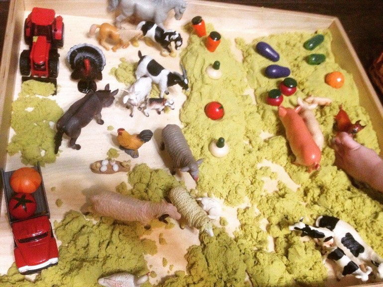 Потом играли в ферму с песком. Сажали овощи, собирали, выясняли кому из животных, что больше нравится, кто что ест и тд.