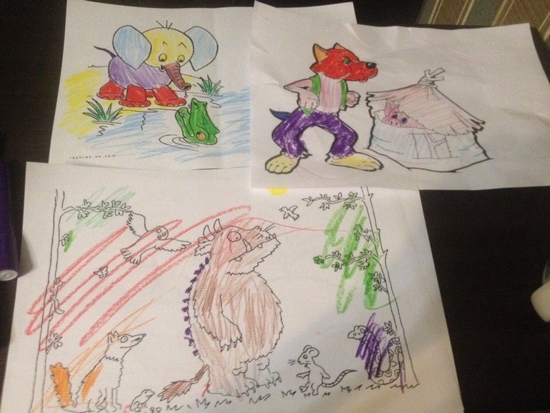 Пока разогревала обед, дала Ярику раскраски. Давно заметила, что он покупные не жалует. А вот те, которые я распечатываю для тематических занятий очень даже. Поэтому я подобрала и распечатала, такие, которые Ярику понравятся. Ярик Груффало раскрасил практически сам, а вот слона и волка, уже красила я, под чутким руководстов сына, цвнта тоже он подбирал))