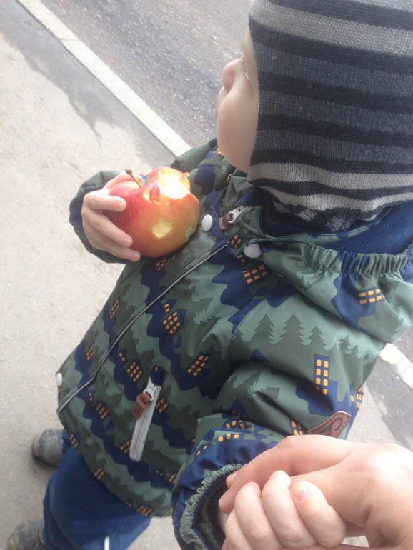 Пока я покупала, Яр обнаружил лотки с апельсинами и яблоками. Я спросила, чего из этого он хочет, все мама не дотащит. Сказал, что яблоки. Взяла пару яблок, и вот на пару секунд отвлеклась, чтобы передать их продавщице, поварачиваюсь, а мой сын уже схватил себе яблоко с витрины и впился в него зубами! Грязное!!!!! Я отняла, заставила выплюнуть, ребенок орет, дай, да дай. Никогда такого не было, а тут как яблоки первый раз увидел! В итоге нам помыли это яблоко и отдали счастливому ребенку. Яблоко большое, неудобно держать, но ел всю дорогу до дома))) довольный, сам добыл же, дома яблоки не особо ест)))) всю дорогу домой смеялась в голос, такой смешной)))