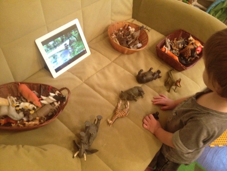 Попросил включить мультик про животных. Включила обучающие видео с английскими словами про зоопарк. Включаю его не для аглийского, просто неплохое видео про зоопарк, но Яр уже выучил как все звери называются. Причем страуса он называет (если показываешь карточку или фигурку) ostrich, а слова страус не признает. Смотрим мы его вот так, в обязательном порядке со всеми животными.