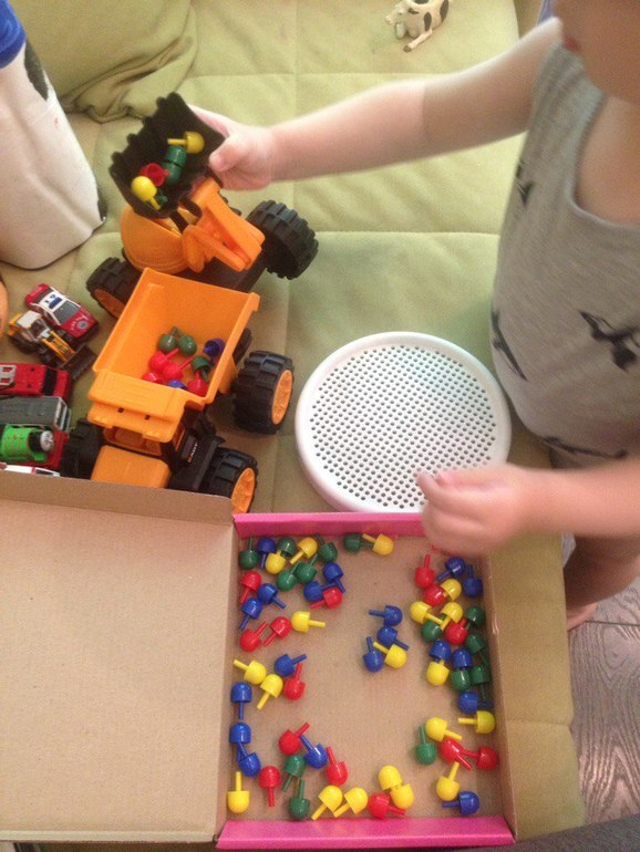 Достала мозаику. Только со всеми мелкими предметами Ярик сейчас играет только одним способом: экскаватор, погрузчик + грузовик)))) Ну что же, тоже тренировка мелкой моторики)))