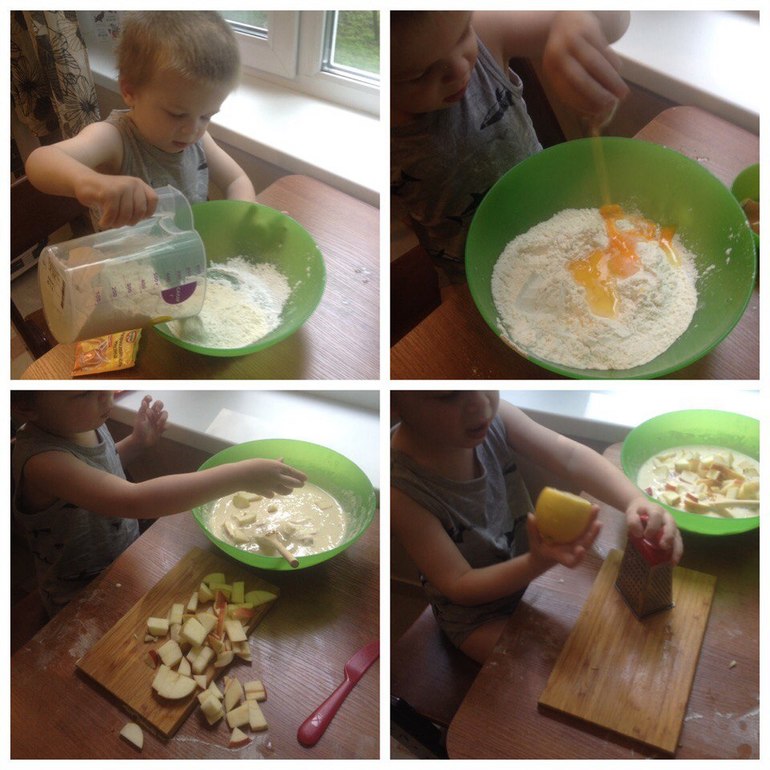 После сна начали готовить пирог с яблоками. Яр высыпал разрыхлитель, муку, разбил пару яиц, сахар, немного воды. Начал все это месить руками, но потом начал ныть, что надо ручки помыть. Дала мешать деревянную ложку. Порезали яблоки. Ярославу давала тонкие ломтики, чтобы он мог их разрезать детским ножом. Дала лимон, чтобы натер цедру. Немного потер, потом начал грызть лимон. Кусает, морщится)))