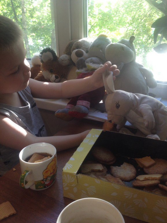 Когда чай заварился, сели пить чай с печеньем (пирог ждать не стали). Устроили чаепитие, накормили всех наших друзей-зверей.