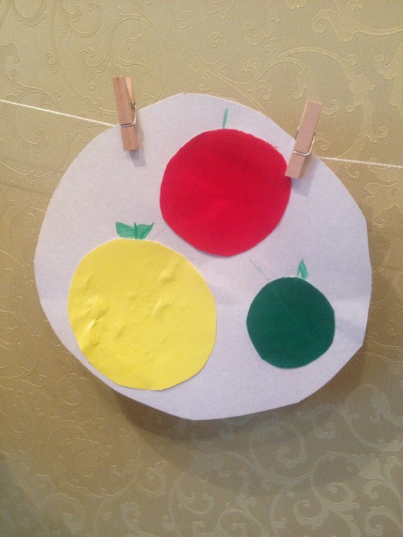 Делали аппликацию - яблоки на тарелке. С творчеством у нас плохо, если пластилин и аппликация еще куда не шло, то рисовать совсем не любит. Даже чтобы уговорить два хвостика у яблок нарисовать, на какие ухищрения только не пришлось идти...