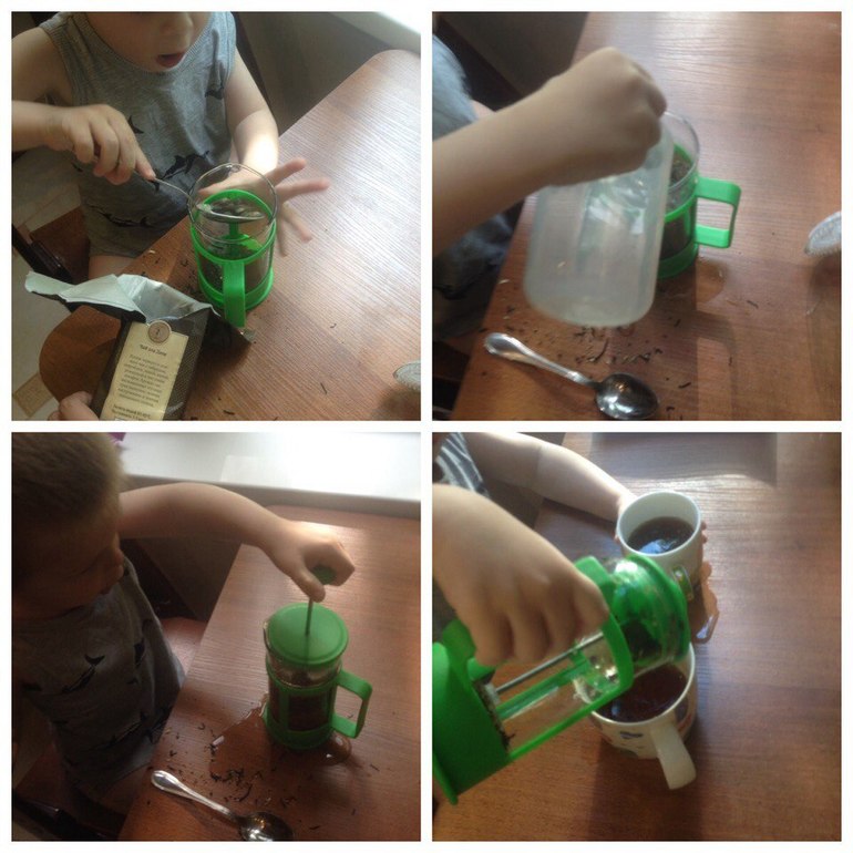 Учились заваривать чай. Сначала дала понюхать разные чаи, выбрал сам, какой будем заваривать. Накладывал ложкой чай в чайничек. Залил туда воду (горячую, но не кипяток).