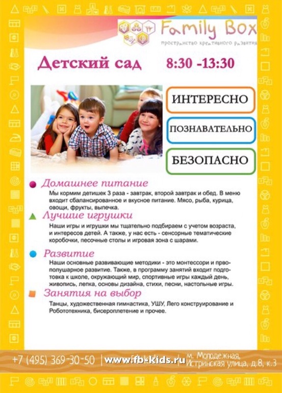 family__boxИдет набор в группы детского сада. Группа "Крольчата" - от 1 года до 3 лет. Группа "Панды" - от 4 до 7 лет. Приходите к нам на экскурсию! Пробный день в группе бесплатно! У нас есть кварцеватель воздуха, все педагоги с высшим педагогическим образованием и очень любят детей! Проработанные программы и всестороннее развитие! С нами интересно! Расписание в группе: 8:30-9:00 приём детишек, зарядка 9:00 - завтрак 9:30- свободная игра 10:00 - спортивное или развивающее занятие 11-00 - второй завтрак 11:15 - спортивное или развивающее занятие 12:00 - творческое занятие 13:00 - обед 13:30 - уход домой Занятия для младшей группы: Раннее развитие Правополушарное развитие* Монтессори* Беби-фитнес и ритмика Творческие занятия - рисование, лепка