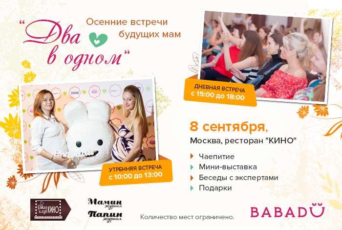 Babadu совместно с приложением mom.life и журналом «Мамин/Папин» приглашают 8 сентября на Осенние встречи будущих мам «Два в одном» в Москве, которые состоятся в уютных залах ресторана "КИНО" (м. Проспект Мира) с прямым эфиром для всех будущих мам страны и зарубежья.
