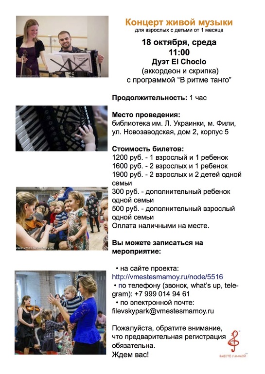 18 октября, в среду, в 11:00 наш филиал откроет двери для больших и самых маленьких ценителей живой музыки. Нас ждет встреча с неповторимым дуэтом El Choclo (аккордеон и скрипка), который выступит с концертной программой «В ритме танго».