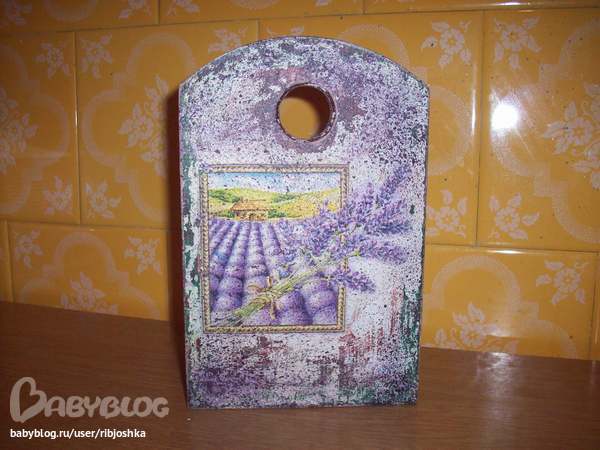 Долго лежала доска подаренная на дачу. Она ужасно тяжелая и служила мне просто подставкой на кухне. Ее ужасно загадили, чай-кофе и т.д. все это вьелось в нее. Вот и пришла мне в голову мысль заклеить все)))