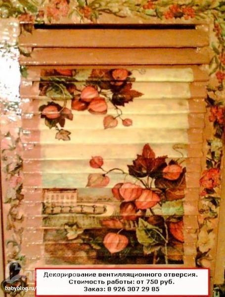 Не знаю может тут уже было такое. Но для меня новое. Для тех мастериц, кто уже всё задекупажил, что мог))) Новые поверхности для декупажа. Вентиляция в квартире, экран под ванной, экраны на батареях, сами старинные батареи мне кажется тоже можно украсить и батареи пластины(там вообще поверхность располагает). Решётки пластиковые для вентиляции в хозяйственном можно купить и задекорировать в технике декупаж по своему вкусу. В инете даже реклама такая есть, цена по моему дикая. Но самим можно интереснее. сделать.