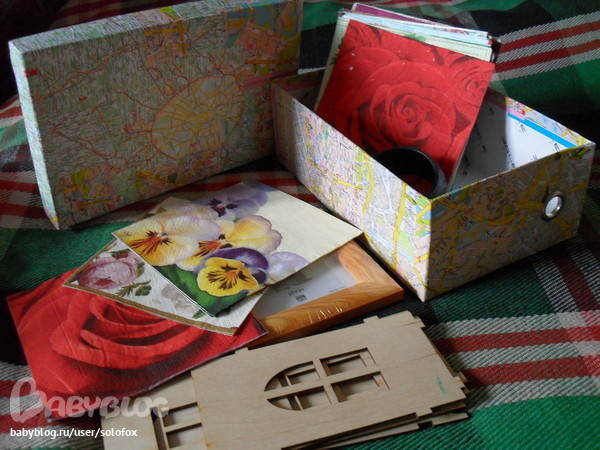 Вот и мой географический декупаж. Коробка для моих декупажных салфеток и заготовок. Правда ещё лаком не покрывала. И хочу ещё машинки на крышку прилепить. Всё же был атлас автомобильных дорог Москвы и московской области. Мастер-класс тут на сайте смотрела(декупаж на картоне). Сделала на обувной коробке.