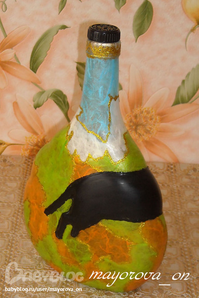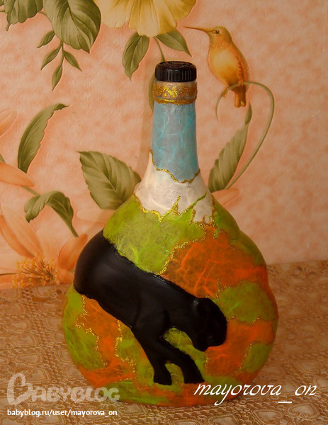 Первя была подарена куму, в принцыпе он её и принёс, что б я ему сделала как-то. Мой муж долго её крутил в руках, в общем она ему сильно понравилась, именно сама форма бутылки. Жена кума нашла у себя ещё такую и сказала сделай мужу, что б и у него была, раз она ему понравилась. Да как тут может не понравится, форма бутылки классная и эта выпуклая (объёная) пантера прикольная, не каждый день видишь такие бутылки))). В общем сделала я и мужу только по другому. Напоминаю, пантера изначально была на бутылке, моя только цветная рисовая бумага и глитер золотой +лак сверху)) Муж сказал. что можно было бы и по темнее-насыщенные цвета, но когда налил коньяк в бутылку - цвет немного потемнел, так что остался доволен.