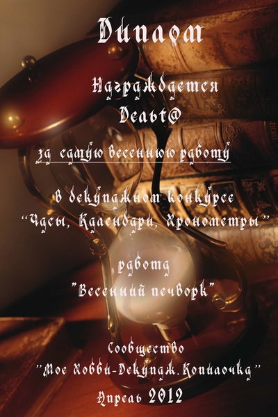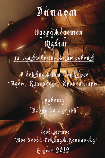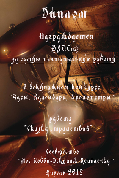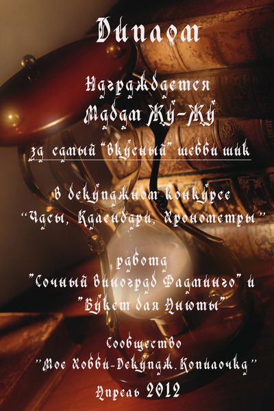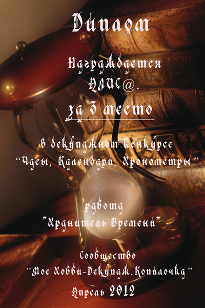 Алиса, спасибо! Дипломы ткаие таинственные у Саши получились, мне очень они понравились! А по объемному декупажу не знаю - надо у Юли, навреное, спросить...