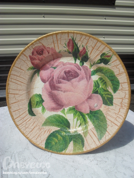 1. Лавандовая тарелочка. Верхний слой краски наносила губкой. Трещинки получились мелкими. Мне кажется, они подходят к рисунку с мелкими деталями.