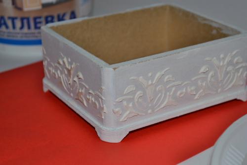 После высыхания грунта наносим через трафарет латексную шпатлевку на все боковинки шкатулки