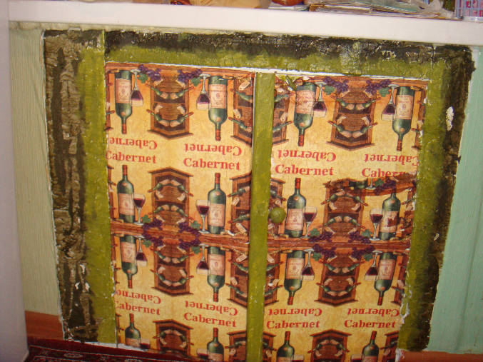 Так вот, сам косяк (ну или как это назвать вокруг дверцы), я тоже обклеила салфеткой белой и решила покрасить. Красная+зеленая и коричневый не получился ))) Как видно по фото, вышло что-то темно-болотное, я еще потом по внутреннему краю салатовым прошлась.
