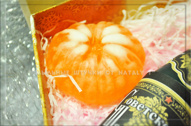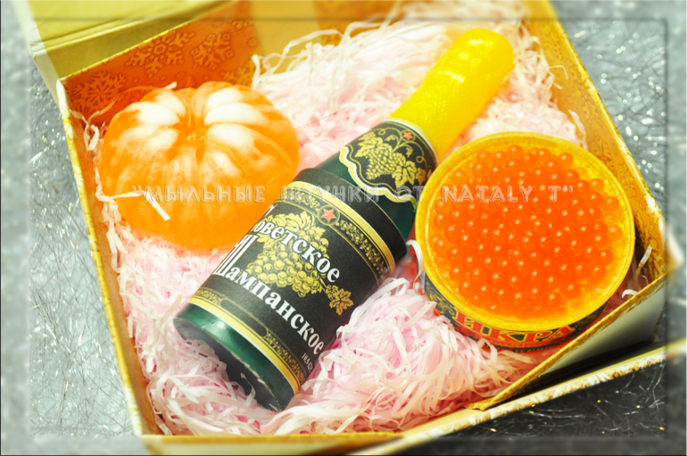 В составе: мыло "Мандарин", мыло "Бутылка шампанского", мыло "Банка красной икры"