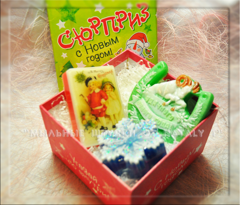Мыло "Подкова цветная", мыло "Снежинка малая", мыло-открытка на новогоднюю тему в винтажном стиле.