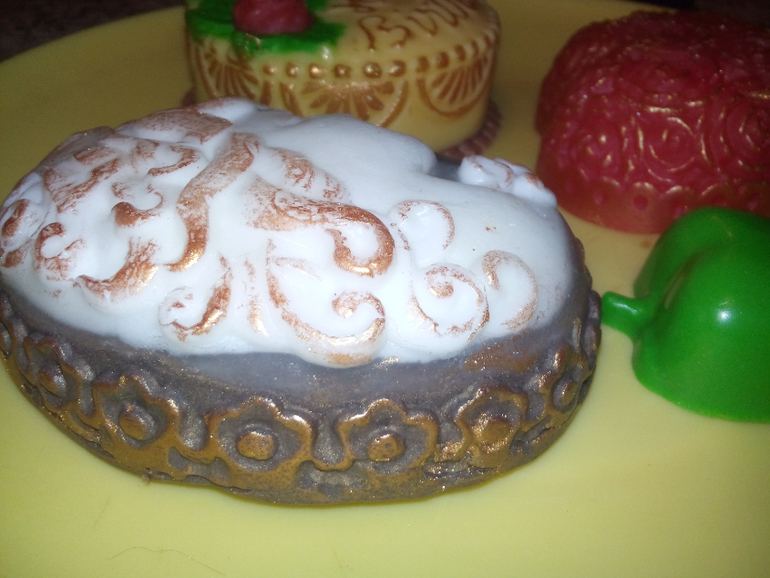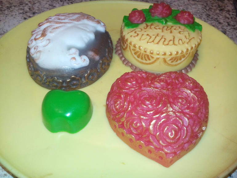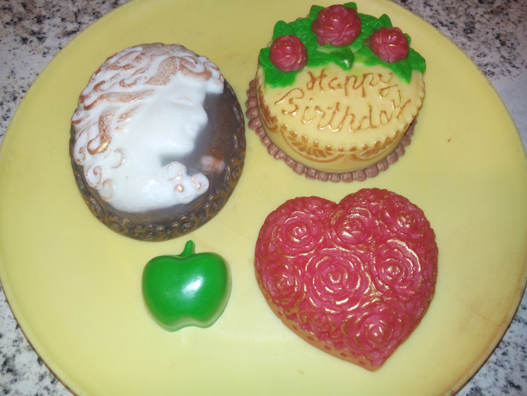 Камея- кунжутное масло и эм мяты. Сердечко- миндальное и эм корицы. Тортик- облепиховое и эм лимона. Во все мылки добавлено касторовое масло для улучшения пенообразования. Яблочко просто из остатков от листочков торта.