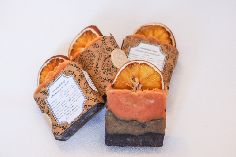 Апельсин и шоколад. ГС. Состав:НСЖК пальмового масла, кокосового масла, пальмоядрового масла, масла зародышей пшеницы, льняного масла и масла авокадо; масло какао натуральное нерафинированное (пережир); эфирное масло апельсина.