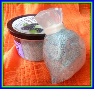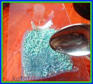 5. Разогреваем прозрачную основу и ложкой выливаем в мешочек. Можно и сразу влить туда основу, но, на мой взгляд, лучше это делать маленькими дозами, так наполнитель не расползется в мешочке, потому как мы его "припечатаем" к месту горячей основой.
