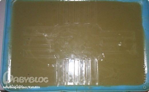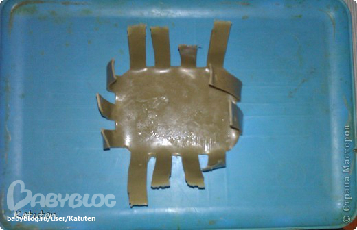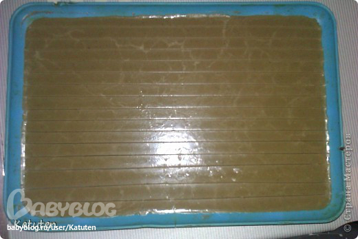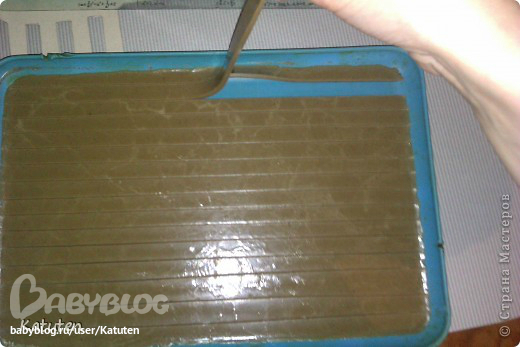 Использовала я все мыльные обрезки, которые только у меня были (надо же было куда-то их использовать), а т.к. преимущественно были шоколадные - корзиночки у меня получились коричневые. Итак, сначала стоит найти форму, в которую мы будем заливать нашу основу. У меня это маленький пластиковый противень. Плавим основу, и тонким слоем заливаем в нашу форму. Слой должен быть не слишком толстым, чтобы легко можно было гнуть как нам надо, но и не слишком тонким, чтобы не порвался. Ждем когда застынет