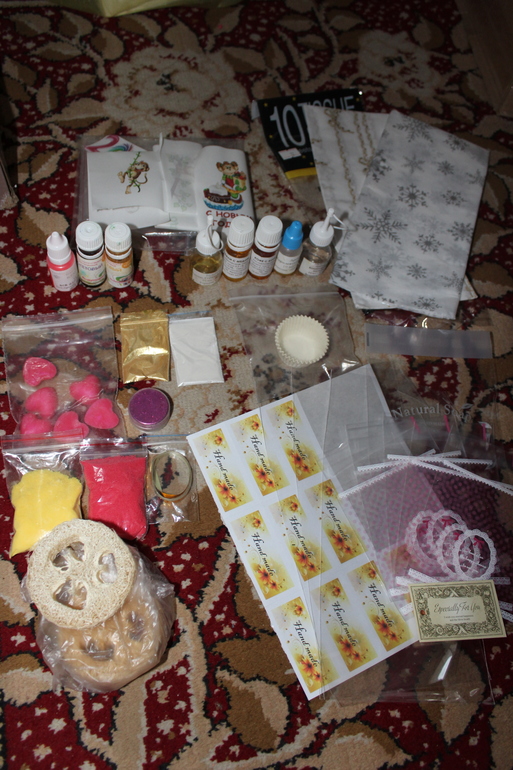 крошка для скрабов,лента-завязка,глиттеры перламутры,сердечки для вплавки,3 красителя,5 ароматизаторов,водорастворимые картинки,бумага тишью,бумажные подставочки