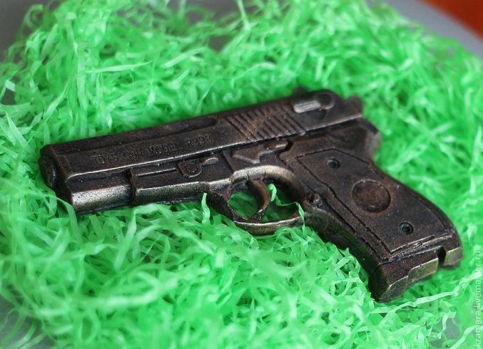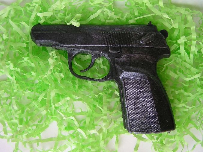 В период следующей "волны" у меня уже была коллекция нескольких пистолетиков, и я решила все же выставить и этот. Не стала народ обманывать, и обозвала этот пистолет именно так, как было написано на стволе. Пусть сами разбираются, нужна ли им эта "игрушка"... Ха-ха-ха!!! Как же я ошибалась!!! В общем, поток заказов на это мыло было таким, что я взяла эту формочку и поскакала к московской мастерице с просьбой ее оттираживать в нескольких экземплярах, потому как я тупо не справлялась с потоком заказов...