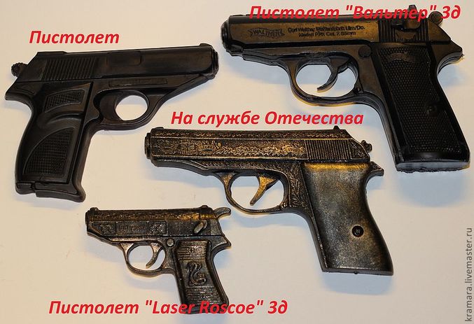 А вот сравнительное фото вышеуказанных пистолетов. Макарова только нет и Тойса, Макаров примерно такой же, как и Вальтер, а Тойс примерно такой же, как "Пистолет". Тот, который у меня обозван "на службе Отечества", на самом деле "На службе Ее Величества", просто я неправильно написала. Так как фото носит скорей информативный, а не рекламный характер, я переделывать пока ничего не стала.