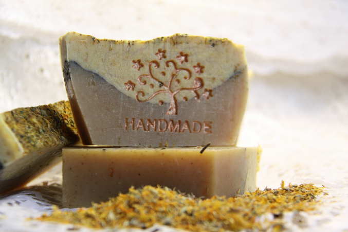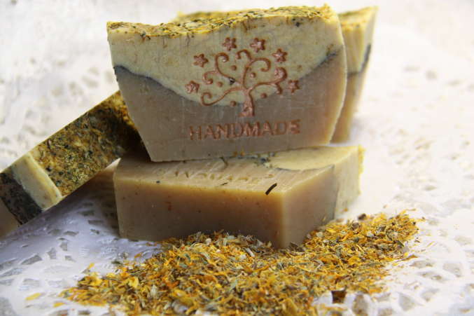 "Календула" Состав: Пальмовое масло, пальмоядровое масло, виноградных косточек масло, кукурузное масло, оливковое масло, SF10%, на отваре календулы, открашено куркумой, украшено лепестками календулы