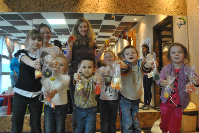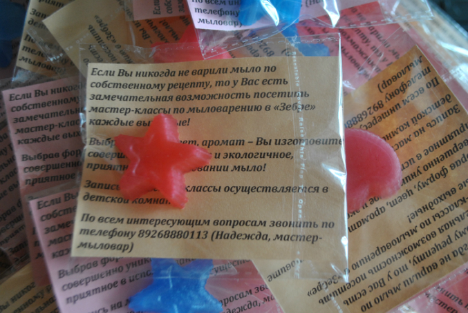 2. Всем родителям детей, которые заходят в детскую комнату, инструктора детской комнаты рассказывали о предстоящем МК, говорили о возможных датах и времени, записывали их номера телефонов, если у родителей возникал интерес к МК, и дарили вот такие маленькие мылки в подарок (помимо мыла, там была краткая информация о том, что мы будем делать на МК и мой телефон для связи)