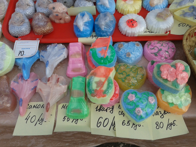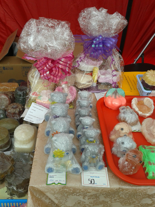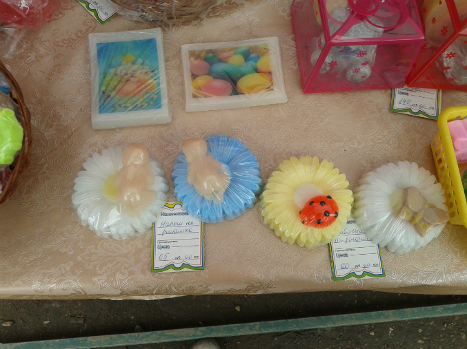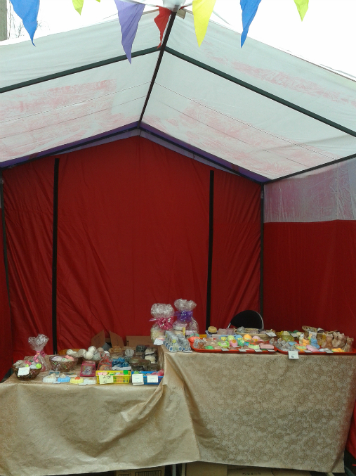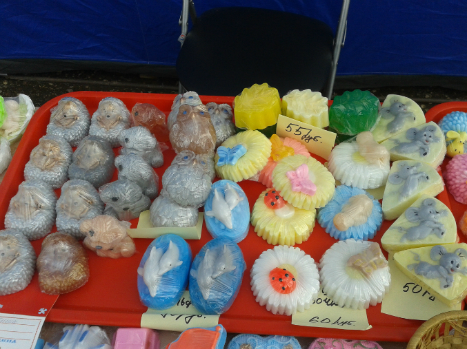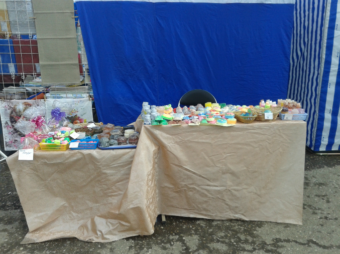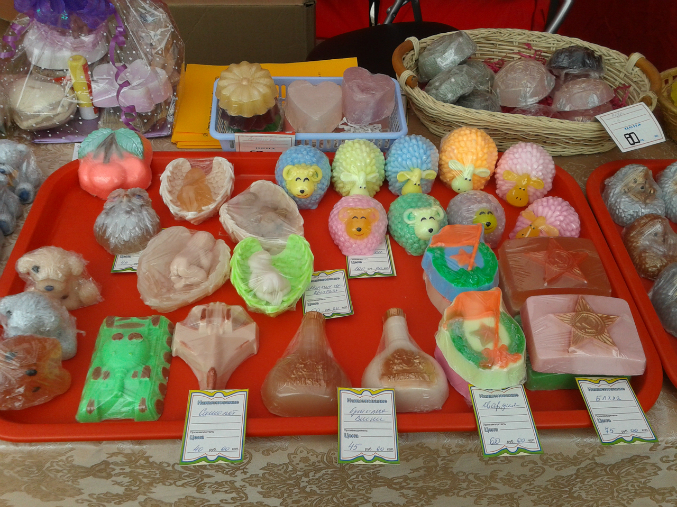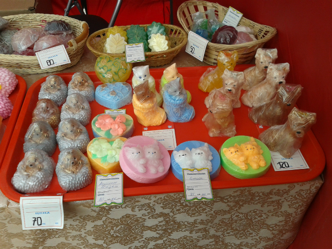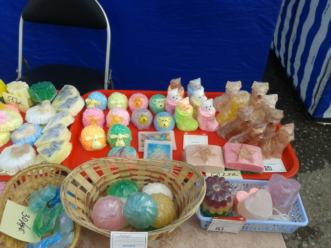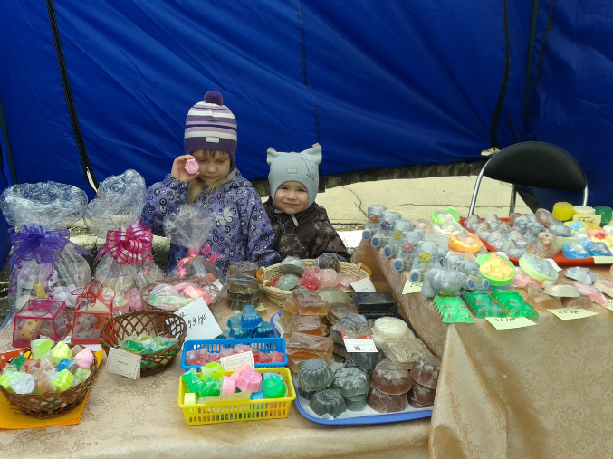 . Длилась она три дня с пятницы по воскресенье. Народу было не много, т.к. опять подвела погода. В пятницу до обеда было солнце, но все работали, а к вечеру похолодало. В субботу с утра потянулись с детьми, до обеда народ шёл, а в обед пошел дождь, сильный что я чуть вместе с палаткой не уплыла ))) В воскреснье народу почти не было, было холодно и видимо основной народ уже прошел в субботу, так что в этот день наша ярмарка работала всего до 17 часов дня. на ярмарке с мылом я была одна, что очень хорошо ))) Продажи шли немного лучше чем в том году, так что я довольно. Устала сильно, все тело болит, вчера ползала по дому и к вечеру очень хотелось спать, а сегодня ели встала. Предложили участвовать 1 и 2 мая, но я отказалась, т.к. во-первых не успею наделать еще мыл, а во-вторых еще два дня я не выдержу стоять, так что отказалась. Фото готовых работ, что потом выставлялось на ярмарке: