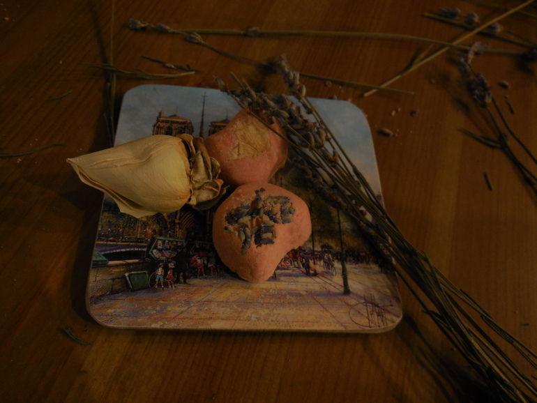 Состав: стандартный набор для бомбочек, краситель красный (у меня он не сильно окрашивает, поэтому на деле всегда получается при окрашивании такой вот розовый цвет), лепестки розы, лаванда, эфирное масло Петитт Грейн, масло виноградных косточек.