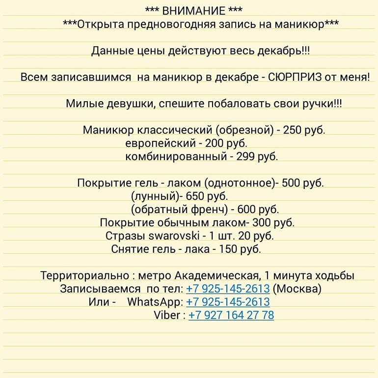 Открыта запись на маникюр на конец Декабря! Очень много желающих привести свои ручки и ноготки в порядок к Новому Году по сниженным ценам!!! Не станьте и вы исключением!!!! Прайс под катом!