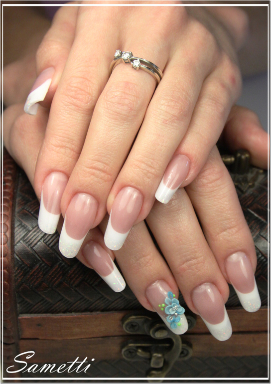 Френч (белый и цветной кончик)Свадебный френч с добавлением белого опала (крошка камня), акриловая лепка и инкрустация фианитами.