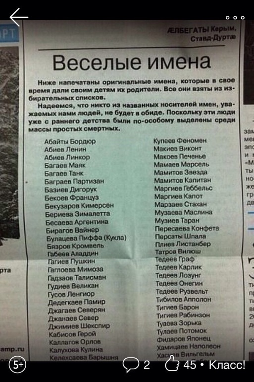 Наталья в Выбор имени для ребенка 11 лет слямзила - посмеяться Интересно почитать Посмотрите еще 20 записей на эту тему Отменить Ответить Вечер Май Ну Марсель, Апполон и Вильгельм-ещё нормально, а вот Шпала, Карлик, Японец, Маслина, Таран и т.п. оченнь посмешили 19.05.2015 Ответить Юся Зорька))) как корову прям))) 16.05.2015 Ответить Полина У моего коллеги сын Апполон))) 16.05.2015 Ответить Унечка Макоев ПЕЧЕНЬЕ!!!Как так то 16.05.2015 Ответить скотенок79 а дочь у него будет Галета Печеньевна 16.05.2015 Ответить Унечка 16.05.2015 Ответить Седышка Север есть такое реально русское имя, а Марсель у татар встречается. Остальные конечно мдааа 15.05.2015 Ответить Аля Не... ну все можно понять... но Шпала!!!!!! 15.05.2015 Ответить Наталия Гагиев Пушкин 15.05.2015 Ответить Какие редкие имена вы встречали среди старшего поколения? Понравилась книга Чаты Беременных Выберите чат: Январята-2026 Февралята-2026 Мартята-2026 Апрелята-2026 Майчата-2026 Июнята-2026 Июлята-2026 Августята-2026