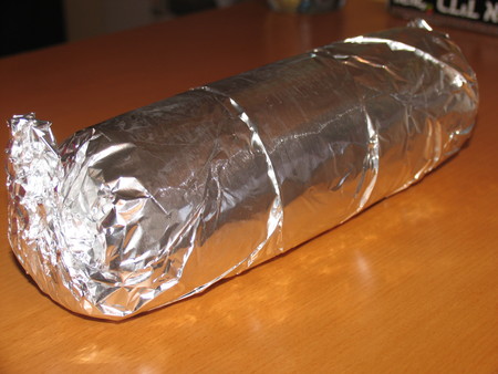 скатываем в толстую колбасу, заворачиваем в фольгу и запекаем 30 мин.