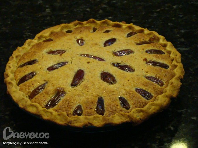 Начинка:90г сл масла (7 ст.лож)всбиваешь с 90 г. (1/2чашки) сахара (лучше пудры), соединяешь с 1 взбитым яйцом. Туда же добавляешь 1 чашку молотых орехов (грецких или миндаля - эффект будет абсолютно разным, с миндалеми апельсинвой водой похоже на пахлаву, а с грецкими - просто вкусный ореховый тарт), 2 ст.ложки муки и 1 ст лжку апельсинового сока или воды. Вымешваешь и выкладывешь в остывшую форму. свеху рскладываешь дольки фиников (у меня были консервирванные груши. Можно свежую нарезать дольками и слегка протушить с сахаром и чай лож сл масла). выпекаешь 25-35 мин, пока начинка не зарумянится. Потом можно разогреть немного абрикосового варенья и сегка смазать им пирог (это по рецепту но можно и без него). Когда пирог остынет, он легко выймется из формы. Сверху моно слегка притрусить сах пудрой. та-дам! готво))))