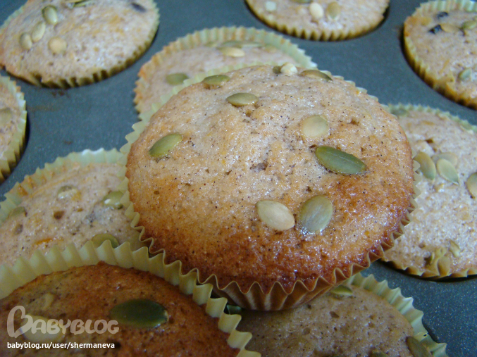 Смешиваем отдельно муку,корицу, соду, соль и сахар, масло, яйца, ваниль. Потом все вместе перемешать с тертой тыквой, добавить (по желанию) семечки. Тесто выложить в смазанные формочки (около 15 шт) и выпекать пол часа при t 175С (350F).