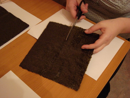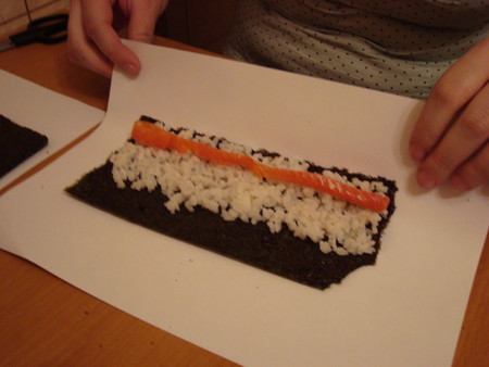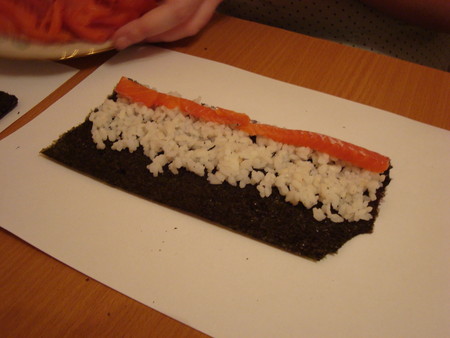 А теперь выкладываем рис и рыбку на лист:
