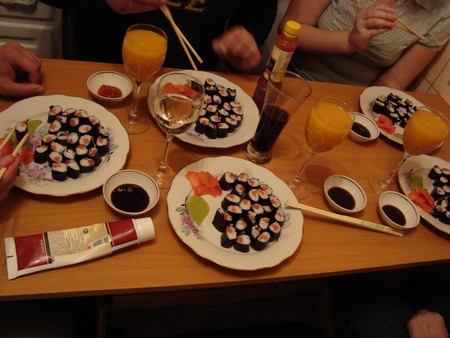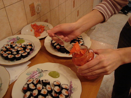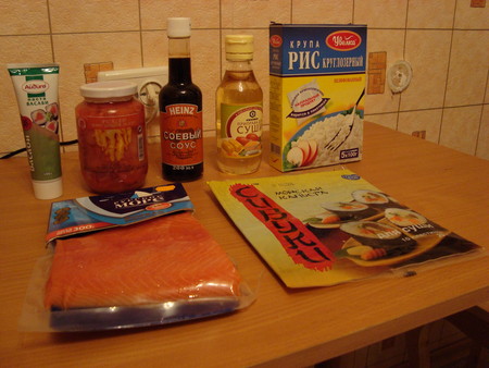 Покупаем необходимые продукты: рис в пакетиках (круглозерный), семгу слабосоленую, васаби (японский тертый хрен), уксус рисовый, имбирь маринованный, листы капусты морской (их еще вроде бы называют нори), соевый соус для суши (или ролл) и палочки.