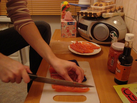 Нарезаем рыбу на тонкие кусочки (если попались косточки - убираем)